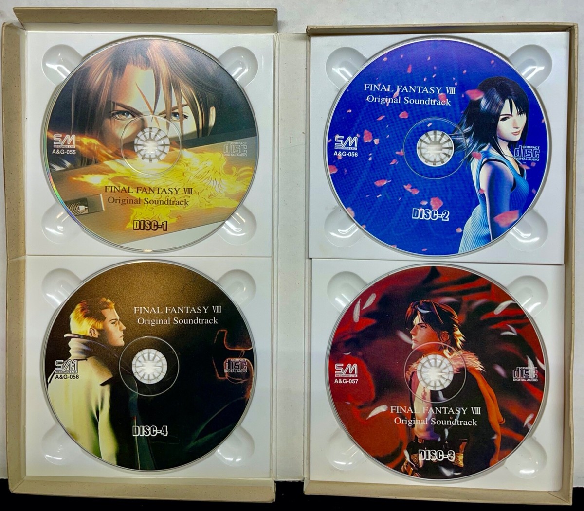 Comes in a long beige box measuring 10" by 5.75", similar to the SS version. Does NOT have an obi. The box has a hinged lid that fits over the bottom part, closing like a gift box. This version does NOT have the song "Eyes On Me." The liner notes are separate from the box and are stapled into booklet form. It has all the text and pictures as in the SS version, EXCEPT the English and Japanese lyrics to "Eyes On Me." Instead of the "Eyes On Me" lyrics on page 17 (yes, they numbered the pages!), the liner notes have the famous picture of Rinoa "flying" between Squall and Seifer. It also doesn't have the credits to "Eyes On Me" and the Ending Theme on page 19 (probably because Ending Theme incorporates Eyes On Me); instead of the music credits, there's just a black space. Also, all company names have been removed from the credits.